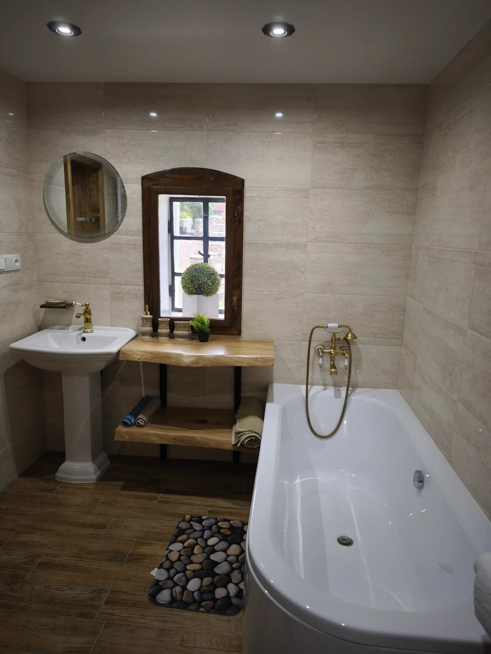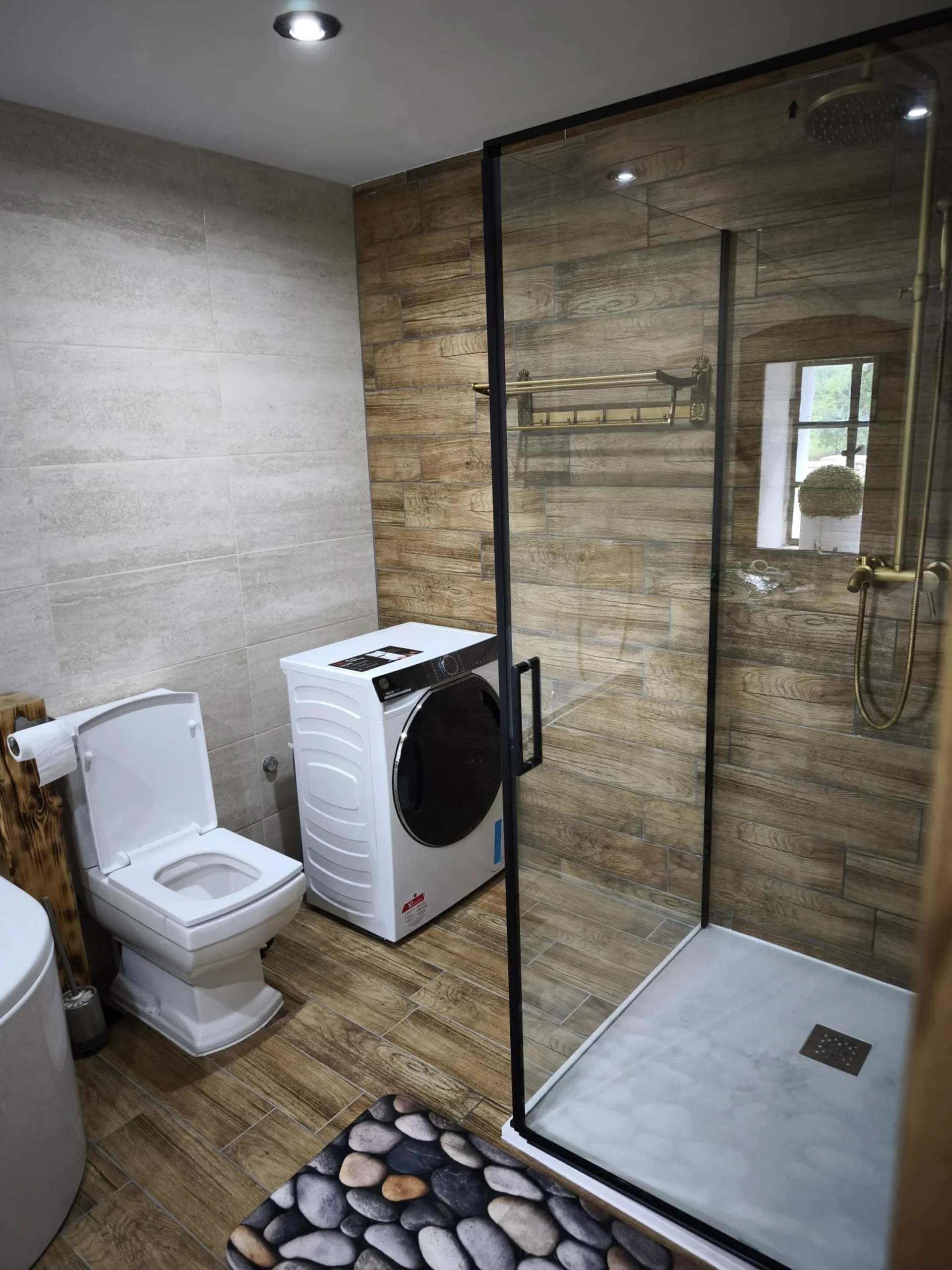 sprchový kout s dešťovou sprchou, vana, umyvadlo, velké zrcadlo, úložné prostory, ručníky, fén, mýdlo, sprchový gel, šampon, pračka