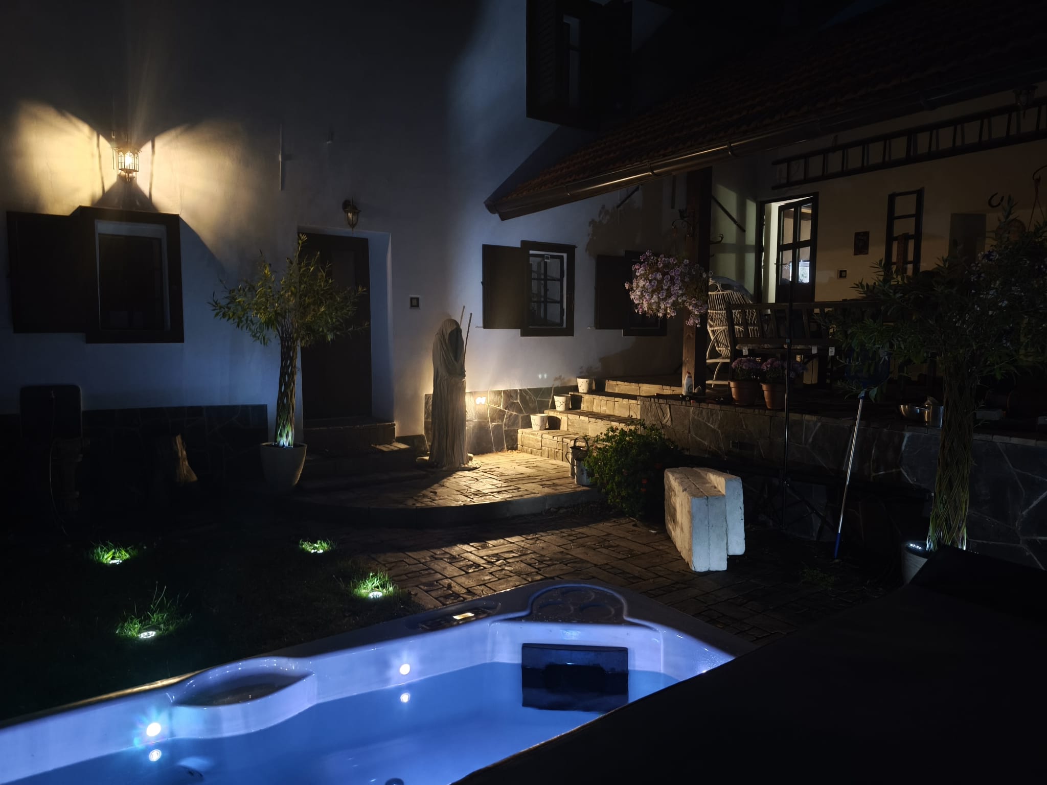 Pro relaxaci venku poslouží tři odpočinkové zóny a zahrada se sadem plným ovocných stromů. Hosté mohou využít možnost stanování v podhradí a vítáni jsou i domácí mazlíčci — prosíme jen o úklid po nich. Parkování je zajištěno přímo u domu pro dvě auta, další místa jsou do 100 metrů od domu.